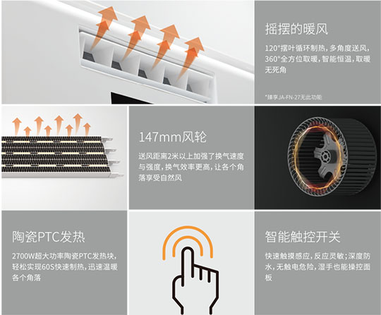 陶瓷PTC加熱,通過不斷循環來提高浴室溫度,送熱極為均勻。2700W大功率, 雙核動力,高制熱量系統設計,使發熱效率更高,熱損耗更低。高制熱,快速溫暖空間, 不僅讓您暢享沐浴時光,即便在洗漱更衣區也可享受溫暖。